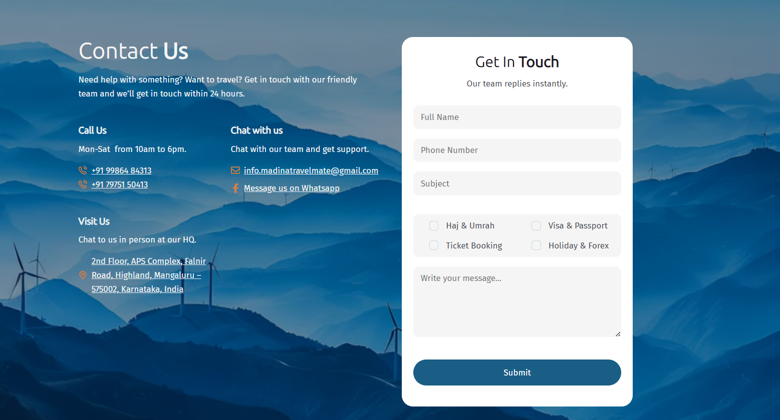 Our focus was to build a modern and fully responsive travel booking website for Madina Travelmate, a growing travel agency based in Kankanady, Mangalore, Karnataka. The goal was to create a professional digital platform that allows customers to easily explore Umrah packages, travel services and submit booking inquiries online.